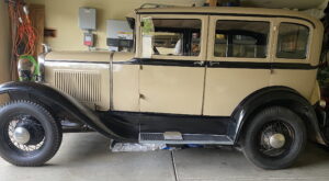 Runs but has low compression. New brakes and drums, wire harness, muffler, exhaust manifold, and minor parts. Rebuilt distributor. Modern shocks. Older interior restoration and paint. Some body rust. Front passenger door is misaligned. Ford ‘V8’ wheels. The Fordor has been in our family for 60 years. Not driven for last 40 years. Tom Reich
