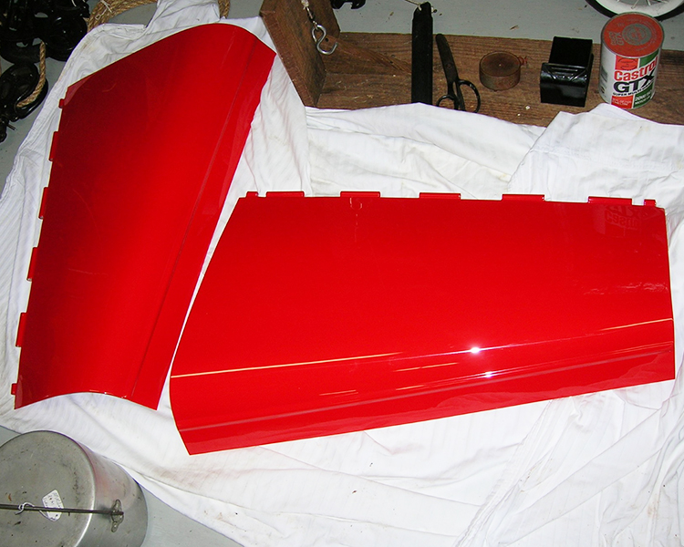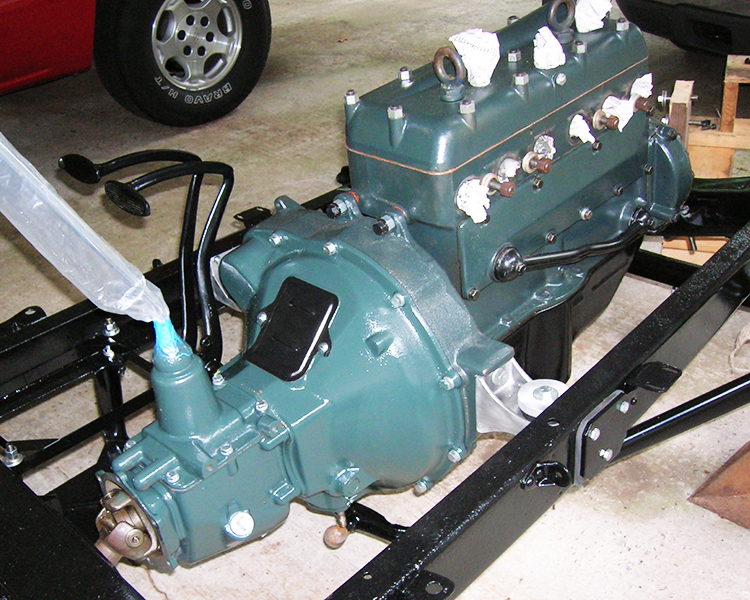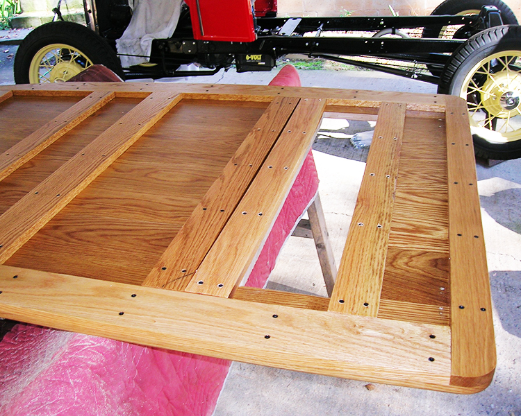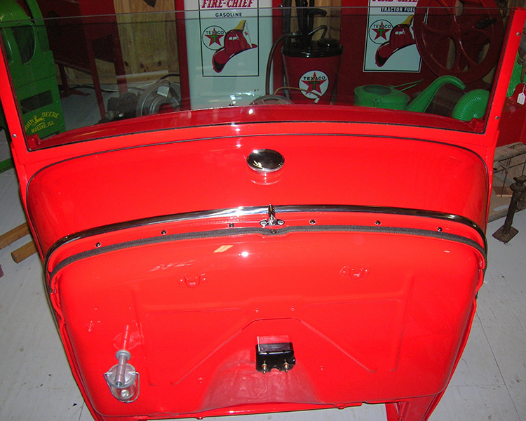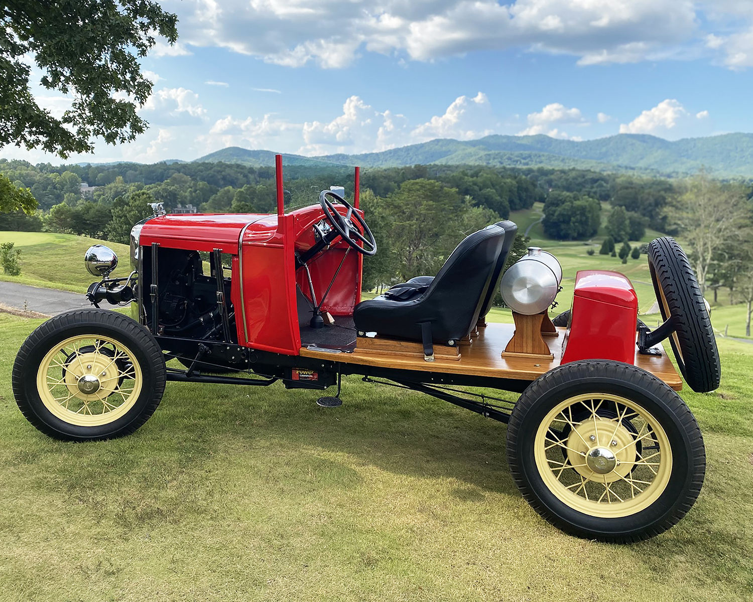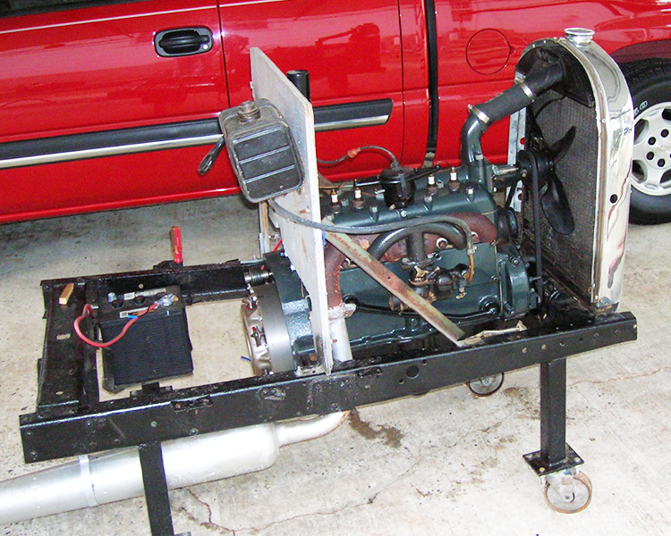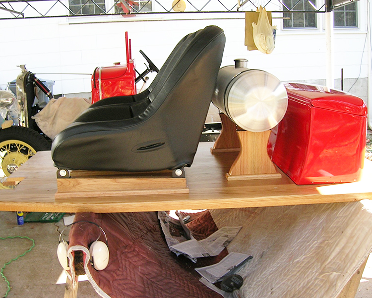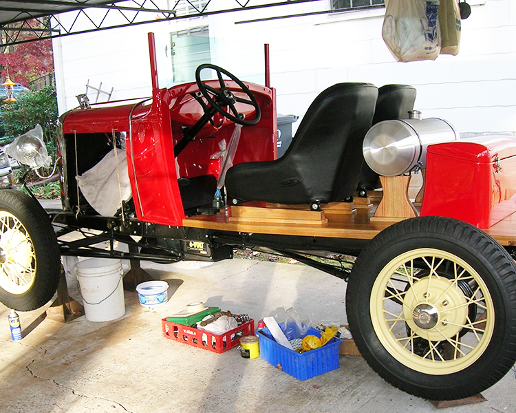 Around 2008 I found a rolling chassis and bought it. My goal was to keep the build simple. I built the bed, gas tank risers and seat rails out of white oak lumber. I used a standard Model A windshield frame and cut it down two ½ inches. I took a Model A trunk and cut four ½ inches off of it and put a raised floor in it to allow for the rear spring. I used a dune buggy gas tank and seats and Walmart men’s belts for hood tie downs. The only modifications to the drive train are high compression head and high speed rear end. The paint is Dodge Viper Red. After getting the body parts back from the paint shop, I was storing the hood halves on the floor in a small building to keep from getting them damaged and one day I was in the building getting something and my rear end hit a shelf that wasn’t secured, and some heavy electrical meters fell off the shelf damaging the hood halves. So, it was back to the body shop for repairs.