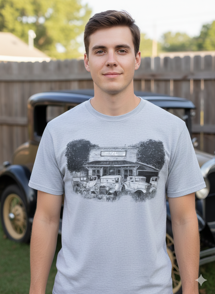 Model A Restorers Club scripted in a printed barnyard setting. A must have shirt, cotton polyester blend.
