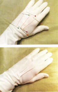 Fabric and leather gloves from the Era had three decorative lines of stitching on the back/top of the glove, sometimes known as gores. It is possible to sew that on a modern glove to make it look as an original. (see photos)